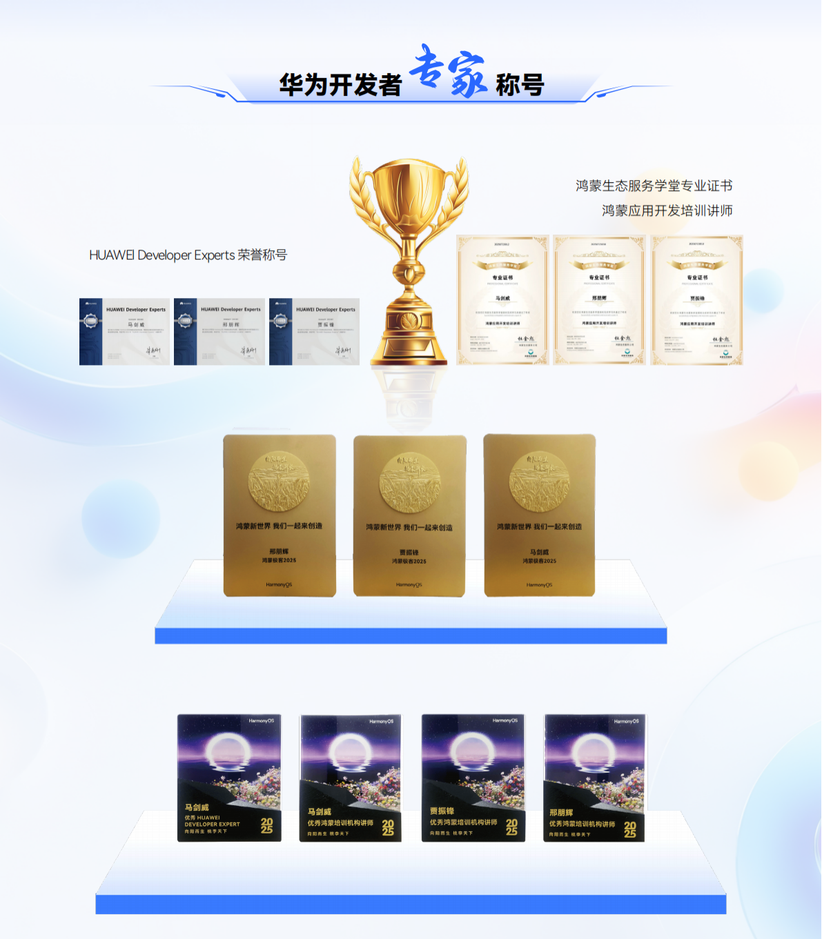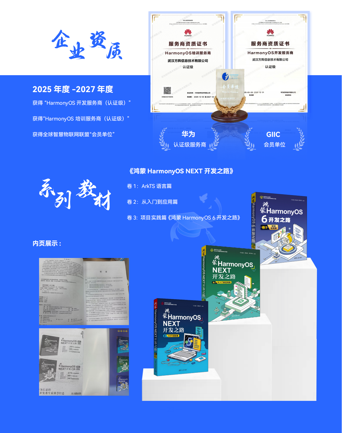 目前,方阵数智设有武汉、成都两个人才培养基地,主要开设的课程有鸿蒙+AI应用开发、鸿蒙+AI智能设备开发、AI运维工程师等。方阵数智核心教学团队成员均为华为公司官方认证的“华为开发者专家(HDE)”并获得鸿蒙生态服务(深圳)有限公司“鸿蒙开发者认证讲师”称号,其出版的《鸿蒙HarmonyOS NEXT开发之路》卷1 ArkTS语言篇、卷2从入门到应用篇、《鸿蒙HarmonyOS 6开发之路》卷3项目实践篇系列教材深受高校欢迎。