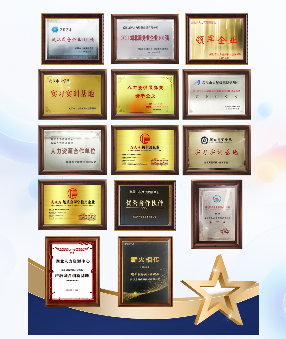湖北方阵人力资源集团有限公司(以下简称方阵集团)成立于2008年5月,是一家具备提供完整人力资源全产业链服务能力的人力资源服务机构。方阵集团及其所属企业先后获得“全国人力资源诚信服务示范机构”“湖北省人力资源服务业领军企业”“湖北服务业企业 100 强”“武汉民营企业 100 强”和“武汉五星级人力资源服务机构”等荣誉称号。